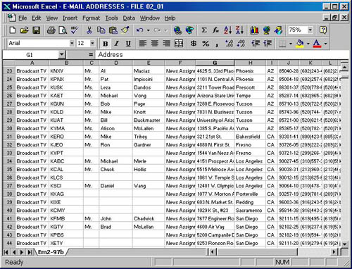 The PRESS PASS GOLDtm database can be imported into your favorite database program like Microsoft's EXCEL, WORD, or Corel QUATTRO PRO. All data is conveniently categorized by: CONTACT NAME, ADDRESS, PHONE, FAX, WEBSITE, AND EVEN THE EMAIL ADDRESS